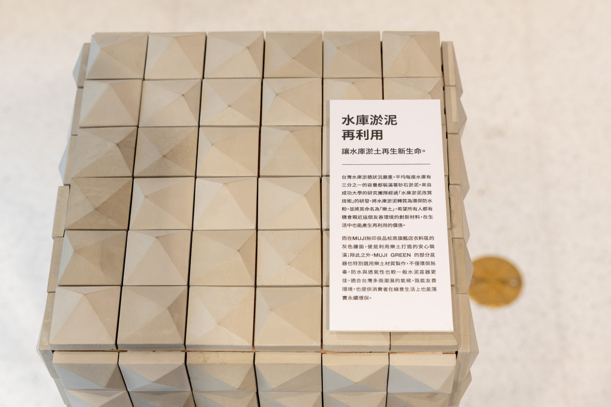 MUJI無印良品為倡導此一理念,特別將其應用於松高旗艦店的牆面裝潢上;除此之外,MUJI GREEN 的部分盆器也特別選用樂土材質製作,不僅環保無毒,防水與透氣性也較一般水泥盆器更佳,適合台灣多雨潮濕的氣候,既能友善環境,也提供消費者在綠意生活上也能落實永續環保。