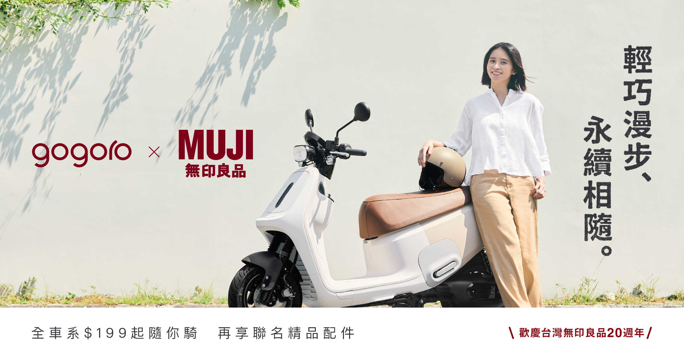 MUJI無印良品與Gogoro於 2023 年推出聯名車款與騎乘風格配件,由設計師深澤直人親自操刀配色,主打「原色棕」、「原色灰」兩款色調,車殼部分元件更首次使用 PCR PP (Post-Consumer Recycled Polypropylene) 回收再生原料,上市至今不到一年已熱銷逾 15,000 台,其中以「原色棕」車款最受歡迎。為共同歡慶台灣無印良品 20 週年,Gogoro 獻上聯名車款限時禮遇:即日起至 6/2,入手 Gogoro VIVA MIX ME 就送聯名款都會極簡連身式雨衣(價值 $1,090 元),入手 Gogoro VIVA ME 就送聯名款超容量巧納袋(價值 $590 元);再享每月 $199 起超值資費方案,單月最高可騎乘 1,500 公里。