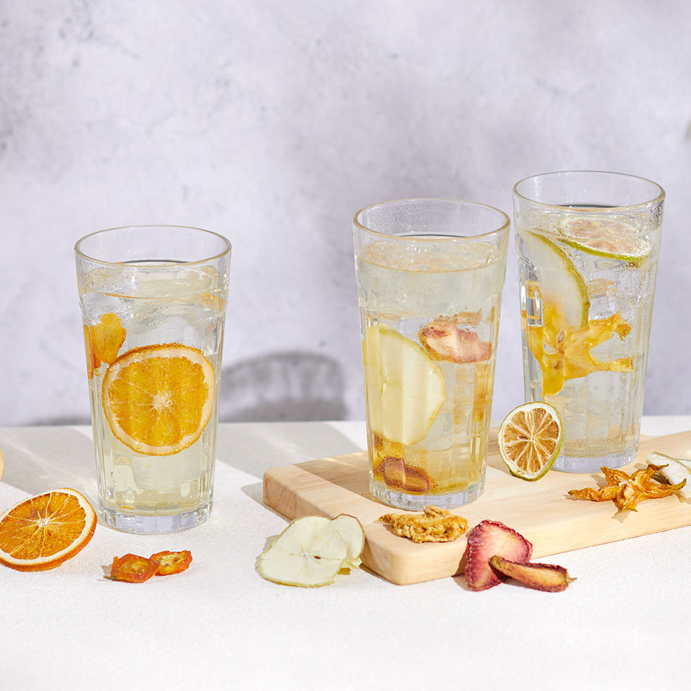 新上市的3款果乾水元素採綜合水果口味,分別為草莓&蘋果&鳳梨、檸檬&柚子&楊桃與甜橙&金桔,MUJI無印良品在製作過程中,特地設成九段不同温濕度的乾燥程序,利用温度的反覆升降提升效率且有助保留更多水果營養、香氣,並讓果乾顏色維持鮮明色澤。獨立包裝的設計方便隨身攜帶,需要時即可飲用。不僅可加入熱水沖泡,也適合放入冰箱冷藏,作為冰飲享用。相較於市售的含糖飲品,不僅熱量低,也能讓不喜歡飲用白開水的顧客品嚐,MUJI無印良品建議顧客可依據習慣,搭配適合盛裝冷飲的攜帶式透明水壺飲用,提升每日飲水量的同時也享受入口含有淡淡果香的酸甜滋味。
