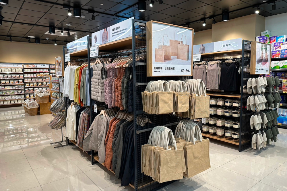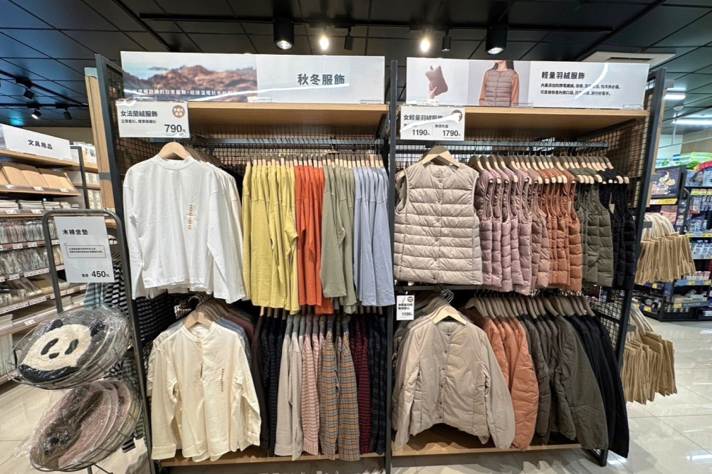 相較於本島店中店僅2座衣服貨架,澎湖中華店導入的「MUJI無印良品」服飾品項更加豐富。包括秋季主打的「天竺圓領長袖T恤」、「法蘭絨長袖襯衫」,入冬首選「輕量羽絨抗靜電內裏無領背心」、「輕量羽絨抗靜電內裏無領外套」等,都是多層次穿搭的首選推薦,提供澎湖居民多元的秋冬衣物選擇,簡約舒適又保暖!