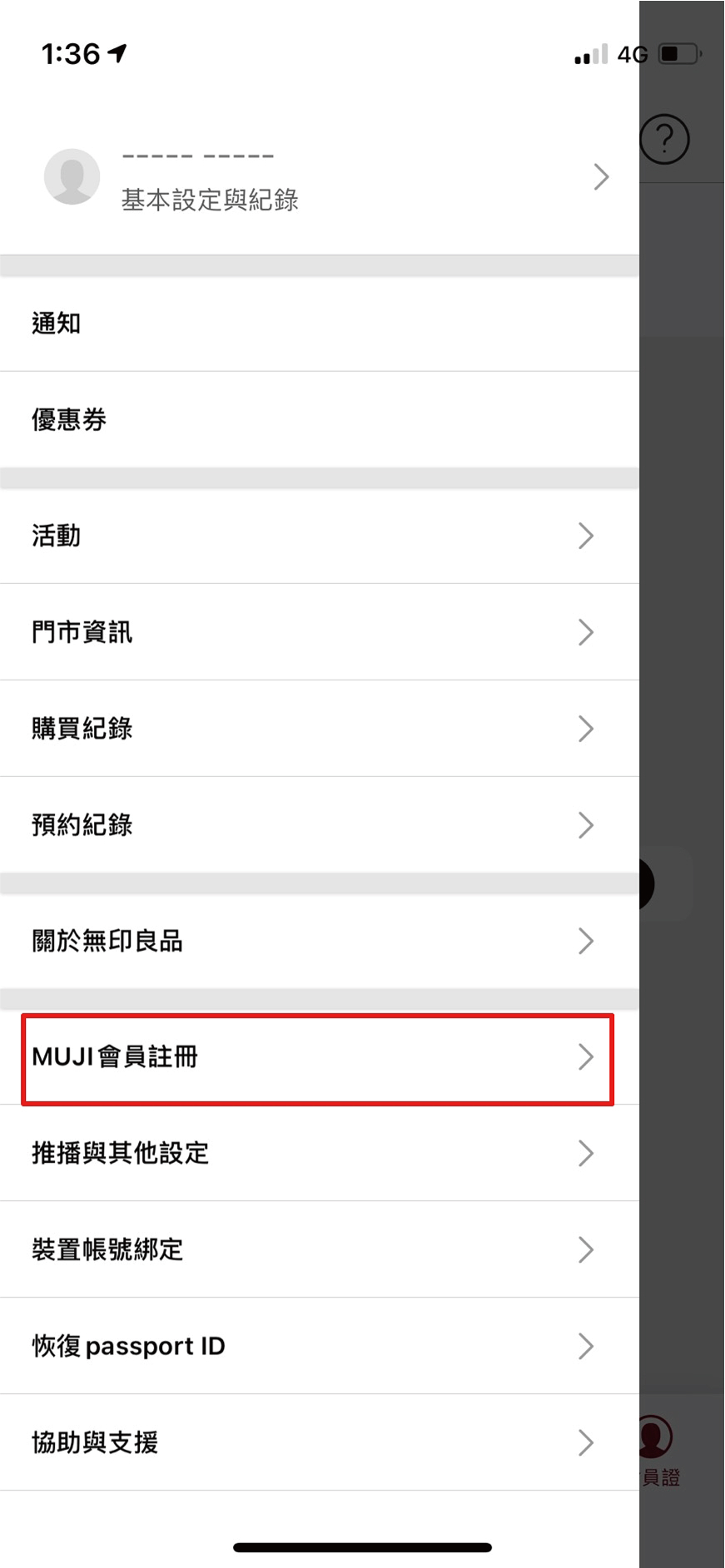 APP的會員證,確認是否有出現黑色綁定按鈕,或左側選單中有「MUJI會員註冊」選項,代表尚未綁定過電話,可點擊進入綁定。