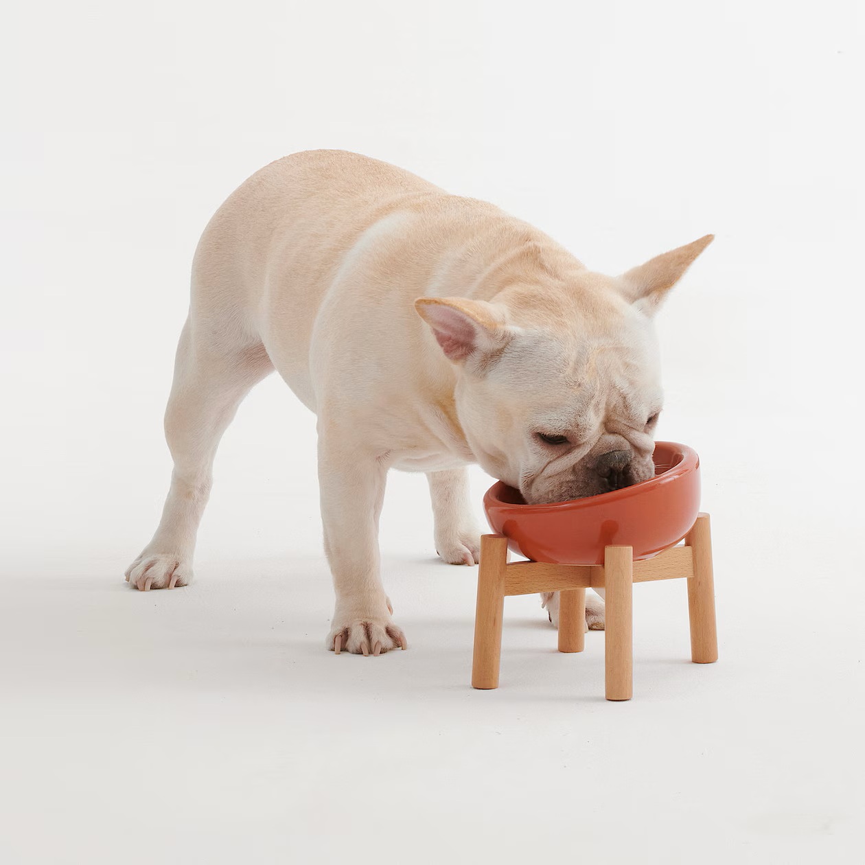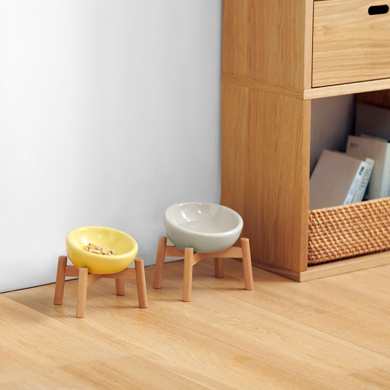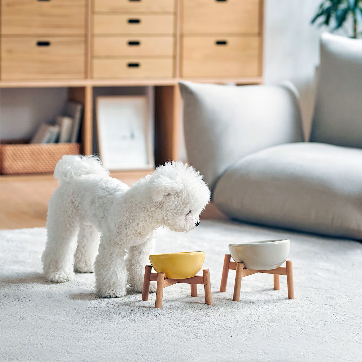 針對寵物飲食,MUJI無印良品推出與日常食器同樣材質的炻瓷餐碗,兼具美觀與便利清潔的特性。搭配專用木架,讓不同體型的毛小孩都能舒適進食,減少頸部負擔。
