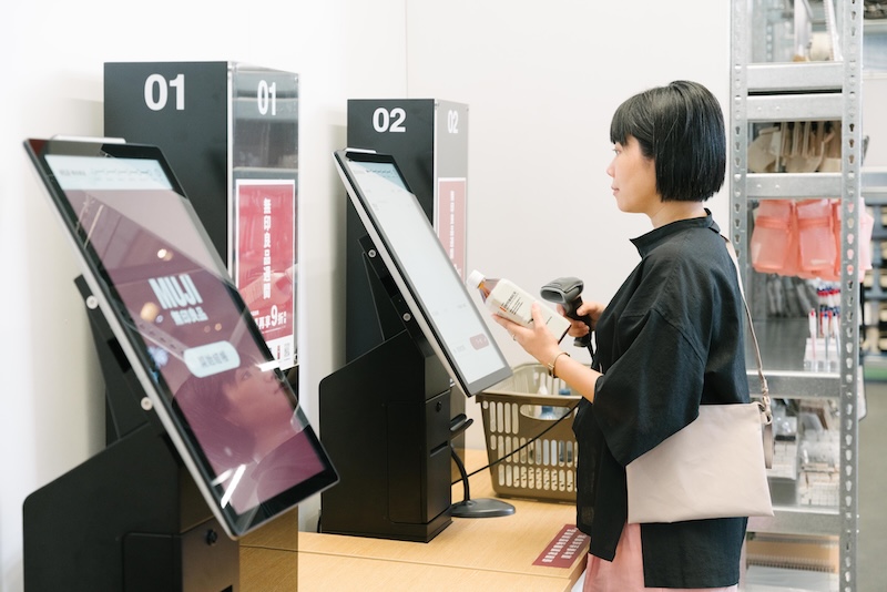 為了提升購物便利性,MUJI無印良品大魯閣台中快閃門市提供「自助收銀」服務,顧客可將結帳商品帶至自助收銀區,透過掃描商品條碼,即可以信用卡或行動支付方式完成結帳,享受更順暢的購物流程。