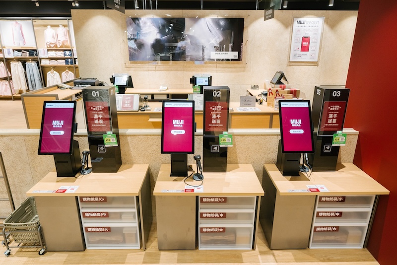 MUJI無印良品愛買台中門市導入「自助收銀」服務,讓購物流程更加快速便利。顧客只需將商品條碼對準掃描器,即可使用信用卡或行動支付完成結帳,並同步累積MUJI會員里程或無印良品信用卡點數,有效縮短排隊時間,提升購物效率,更快速地完成購物流程。