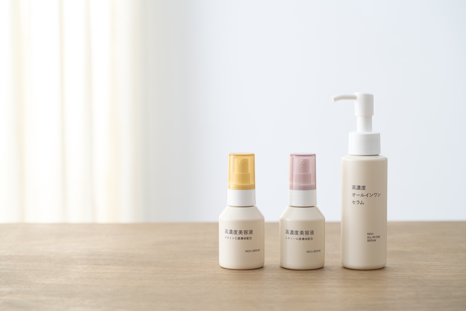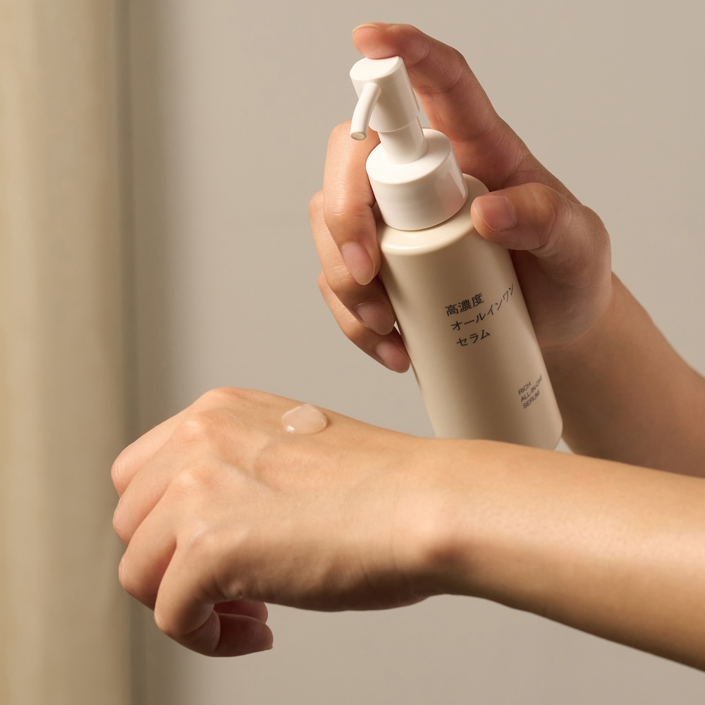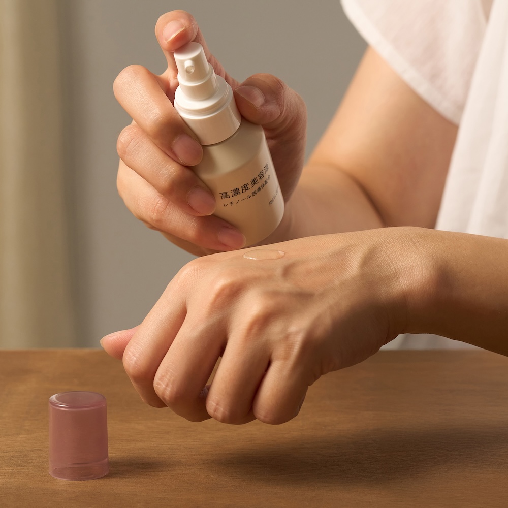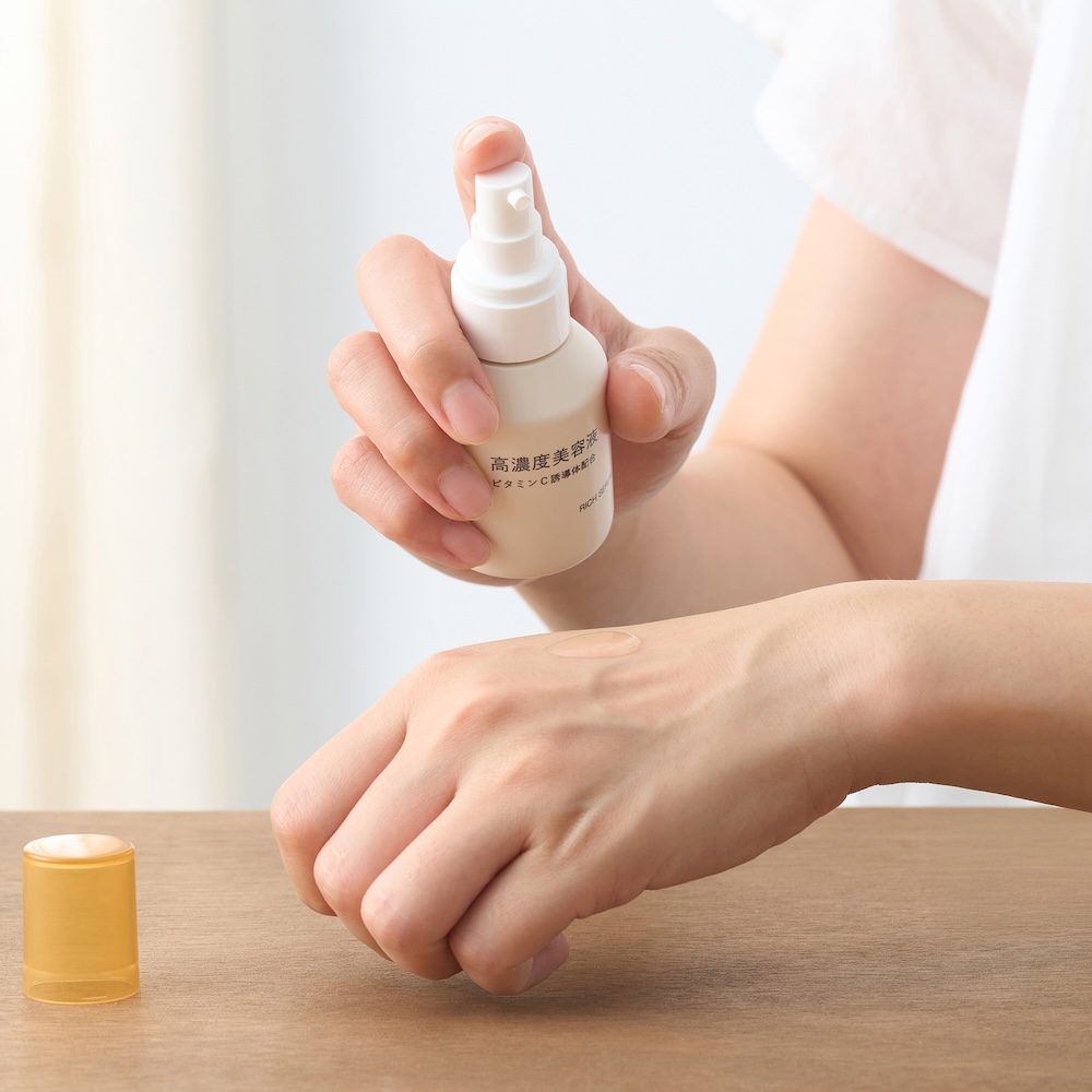 MUJI無印良品建議早晨使用高濃度美容液 維他命C誘導體,讓10%的維他命C誘導體搭配橙皮精華,喚醒肌膚、提亮氣色;夜間則換用高濃度美容 A醇誘導體,結合0.1%的A醇誘導體與積雪草精華,改善粗糙與細紋,溫和不黏膩的質地,兼顧緊緻彈性與舒適膚感。
