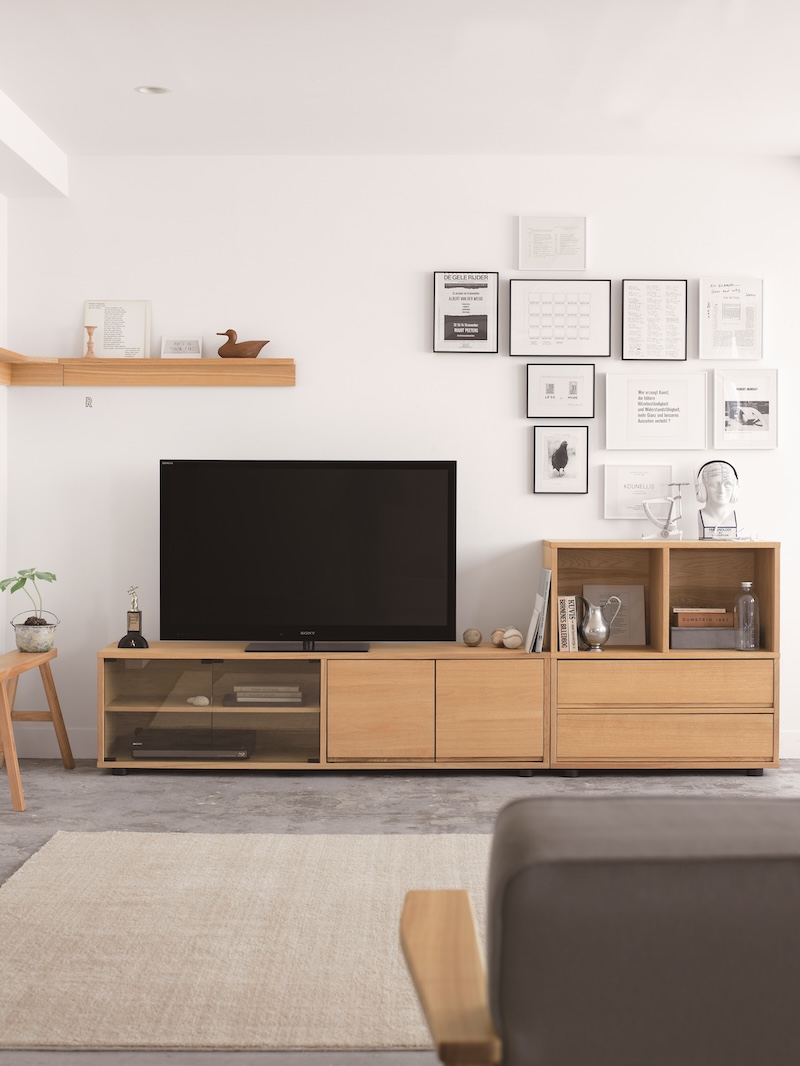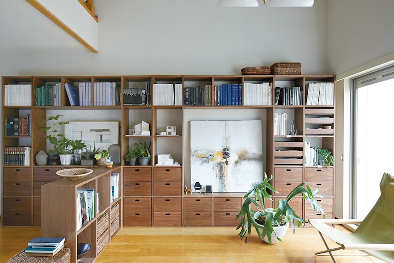 先規劃空間中的收納區與動線區,MUJI無印良品建議可利用自由組合層架系列、SUS層架系列及橡木收納櫃置於空間中單側,打造一整面的垂直收納空間,同時也讓空出的另一側面積更加完整,令動線順暢也能營造留白空間彈性運用。