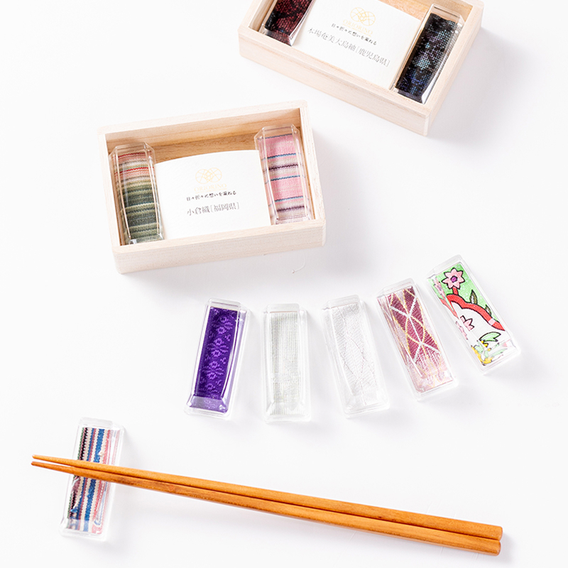 品牌致力於將日本各地的傳統織品融入現代生活。採用獨特技術將紡織品封裝在透明樹脂物中。