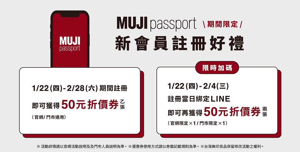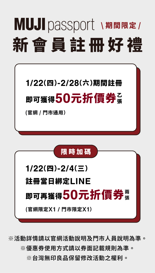 - 1. 1/22(四)00:00-2/4(三)23:00止,自MUJI無印良品官網、MUJI passport APP或MUJI無印良品LINE官方帳號註冊新會員,並於24小時內綁定LINE帳號,即可於綁定成功隔日獲得MUJI passport優惠券兩張。(官網限定優惠券x1及門市限定優惠券x1)。